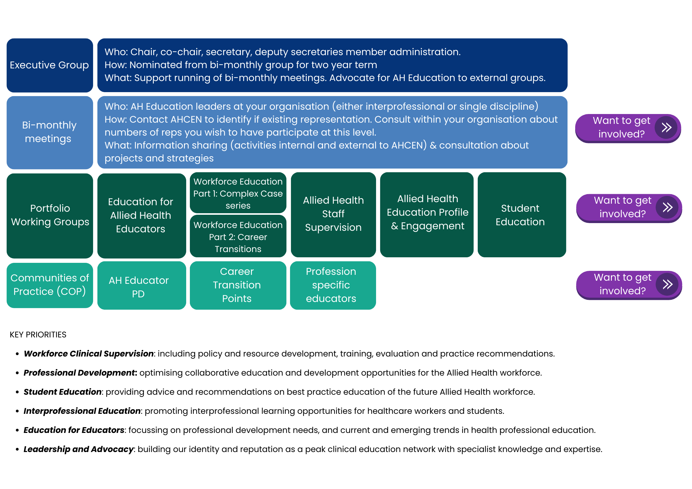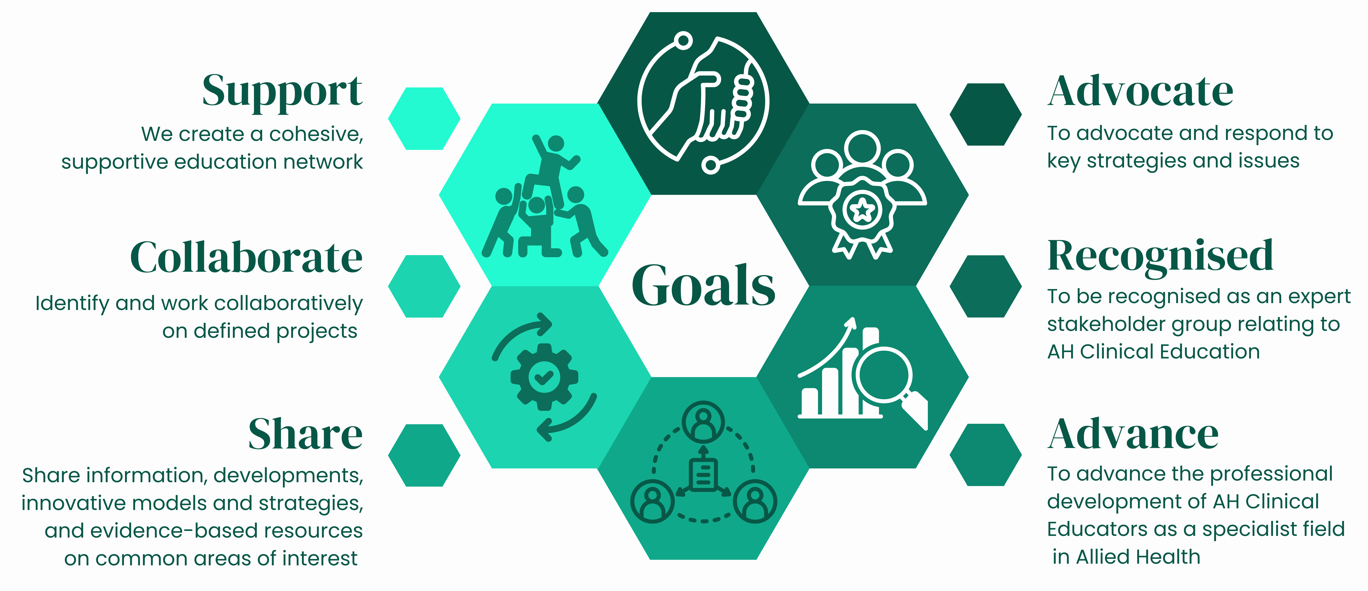 We are a professionally diverse group from both the AH Therapy & Science disciplines, united through our contribution to the strategic direction of clinical education and training in Victoria and in driving innovation and excellence in education practice.