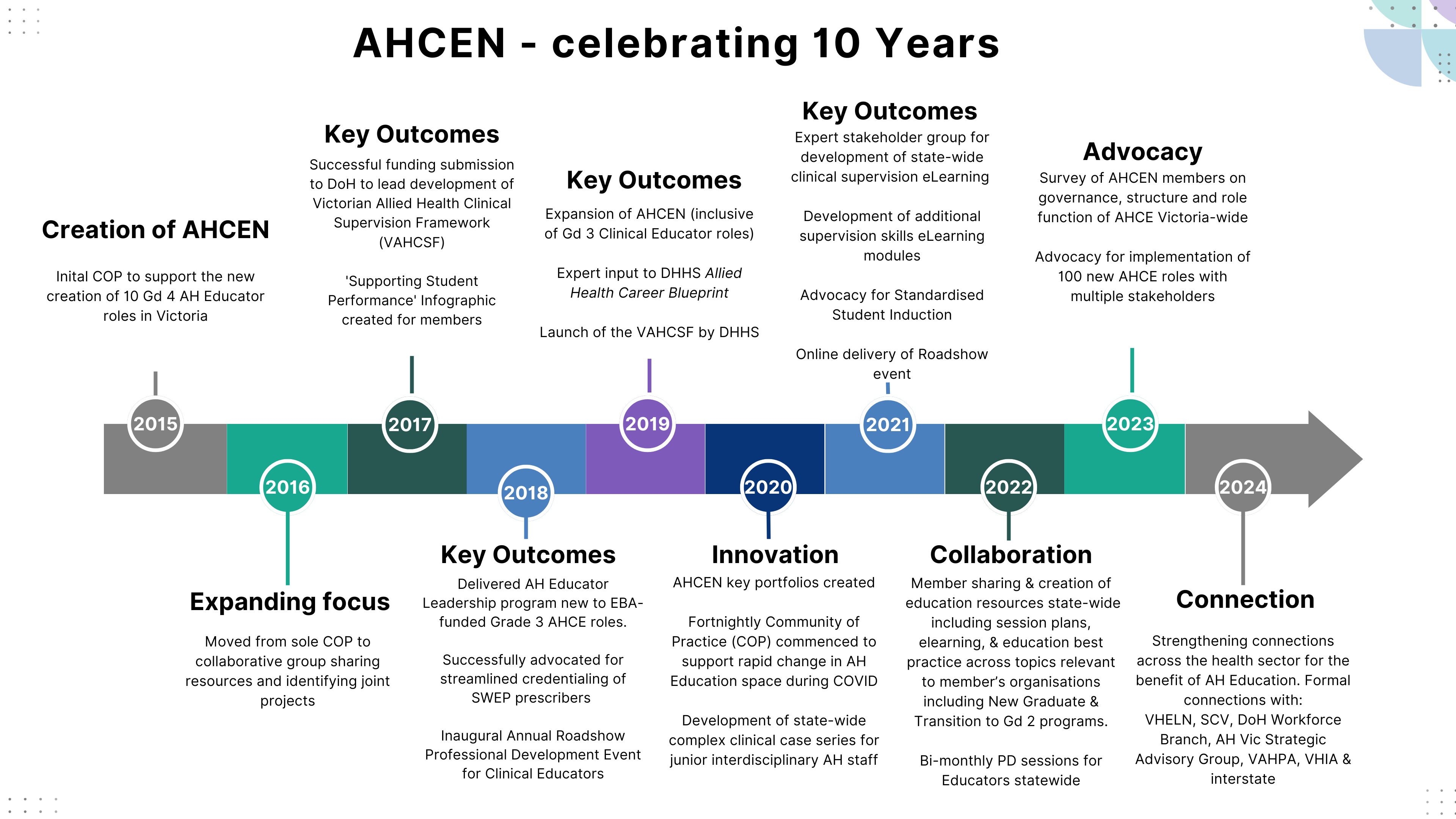 The Allied Health Clinical Educators’ Network (AHCEN) brings together 60 plus leaders in Allied Health clinical education in Victoria from over 30 metropolitan, regional and rural health services.